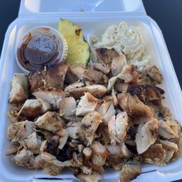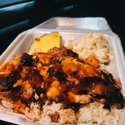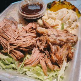 I'm rounding up my review. Ultimately, I'd say it's a 3.5 for the quality and flavor of the food, but the overall value of the meal is worth bumping up to 4 stars for me. I got a Small Plate (which was still huge) with the Kalua Pork and the Volcano Chicken and the pineapple fried rice and potato-mac salad. The pork was pretty good, basically exactly what I expected. The chicken was also good, but didn't strike me as particularly outstanding. Based on the smells, I'd say this is more of a BBQ joint than specifically a Hawaiian place. I'll have to try out their BBQ sometime in the future.